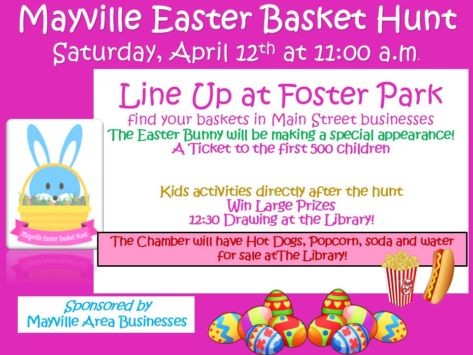 Line up in Foster Park to get your ticket! Walk Main Street in Mayville and search for your number from your ticket in local business windows. Go inside and get your basket! Larger prize drawing at 12:30 at the library. Food available at the library.